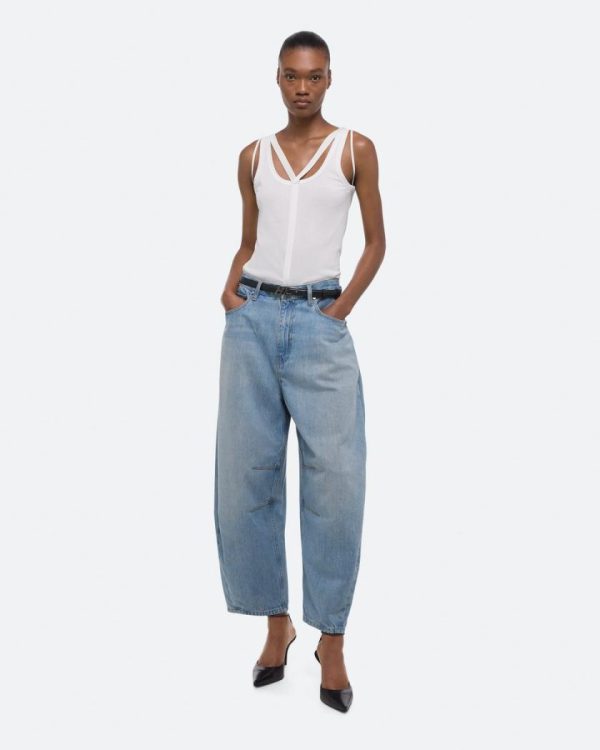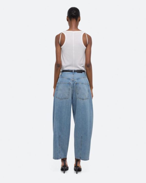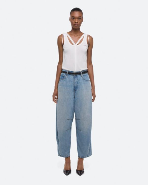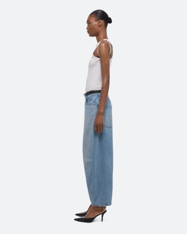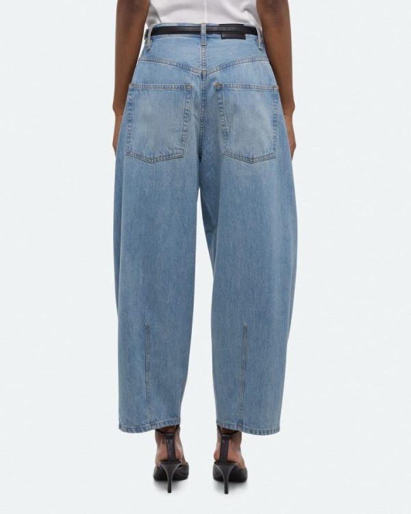 Barrel-leg jeans in light indigo wash. Darts at the knee and ankle sculpt a round, curved leg shape.Fits true to size. Model is 5’11” and wears size 26.