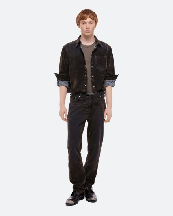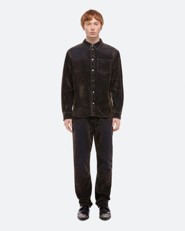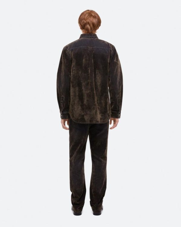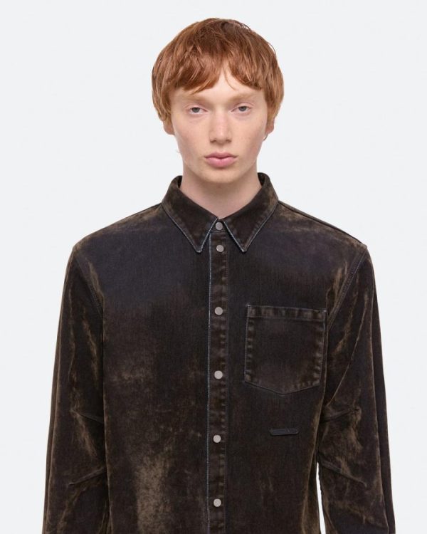 Classic button-front denim shirt with directions; seaming that creates a softly curved sleeve. Finished with a flocked velvet texture that lets the denim base peek through from different angles, and wears naturally over time. Matches the Flocked Worker Jeans.Fits true to size. Model is 6’1” and wears size M.