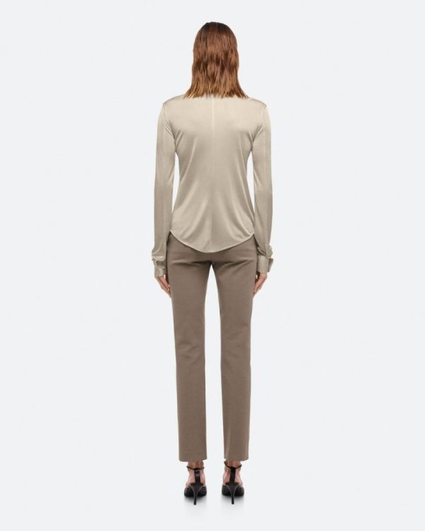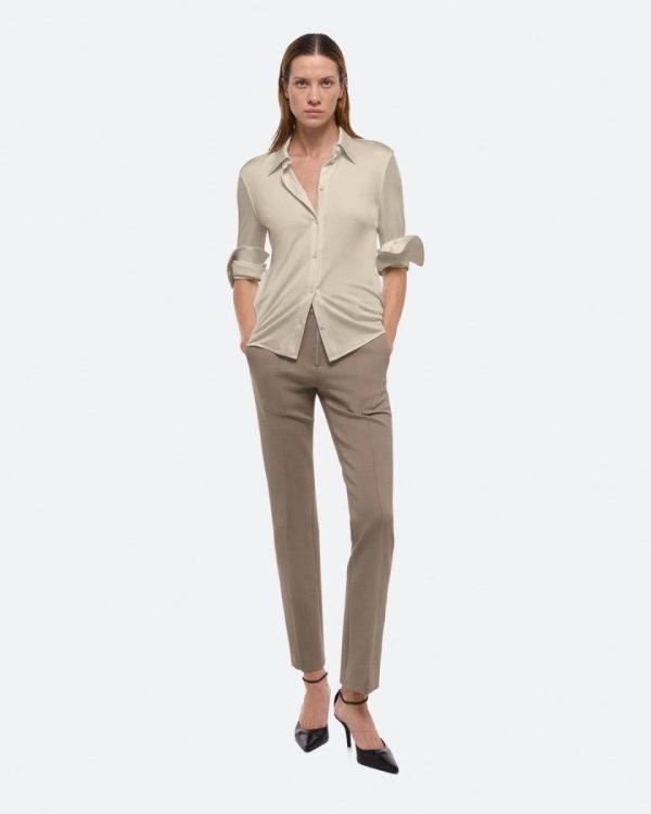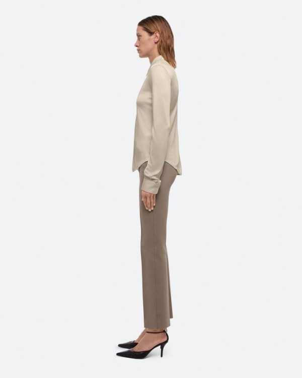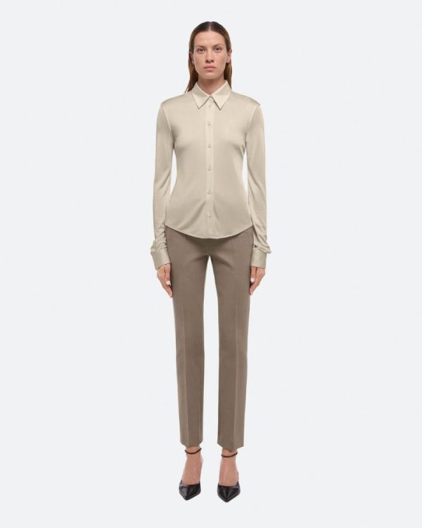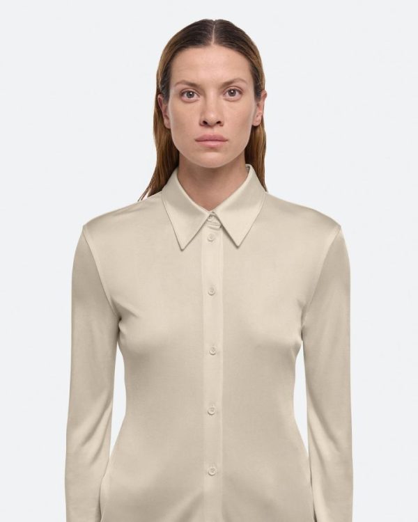 Classic slim fit shirt in fluid Italian viscose jersey. Matches the Fluid Car Trouser.Fits true to size. Model is 5’11” and wears size S.