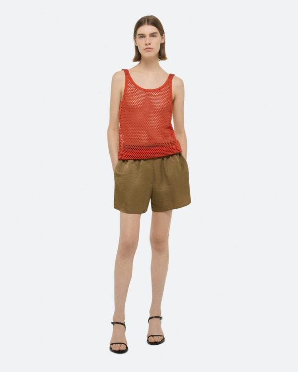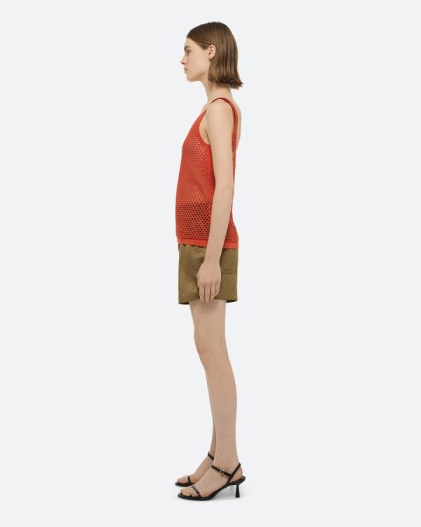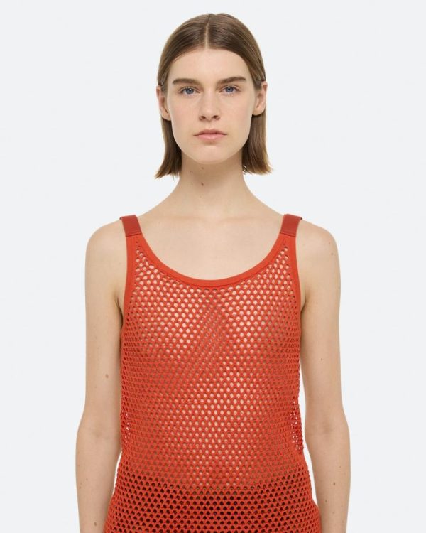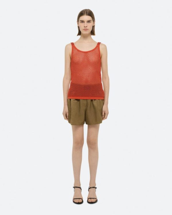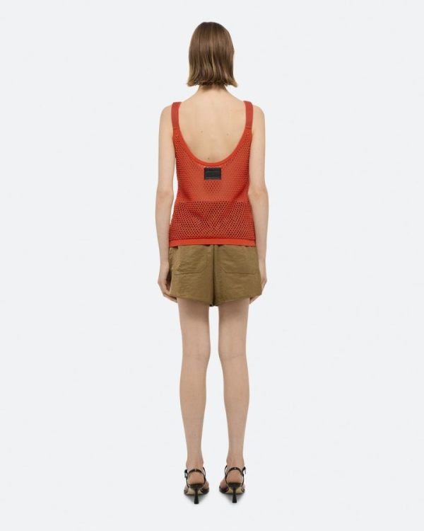 Cotton tank top in an open crocheted mesh. Finished with utility details and our signature seatbelt tape.Fits true to size. Model is 5’10” and wears size S.