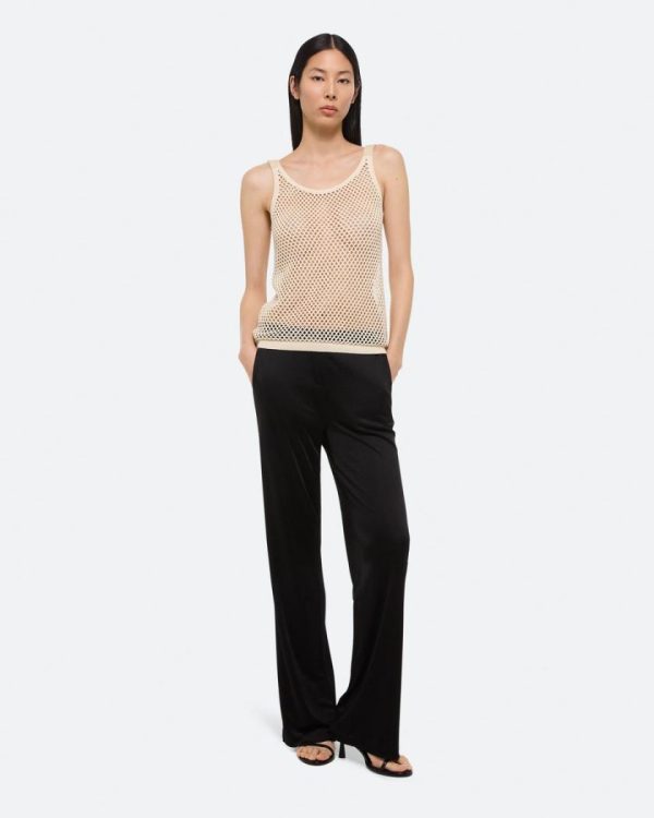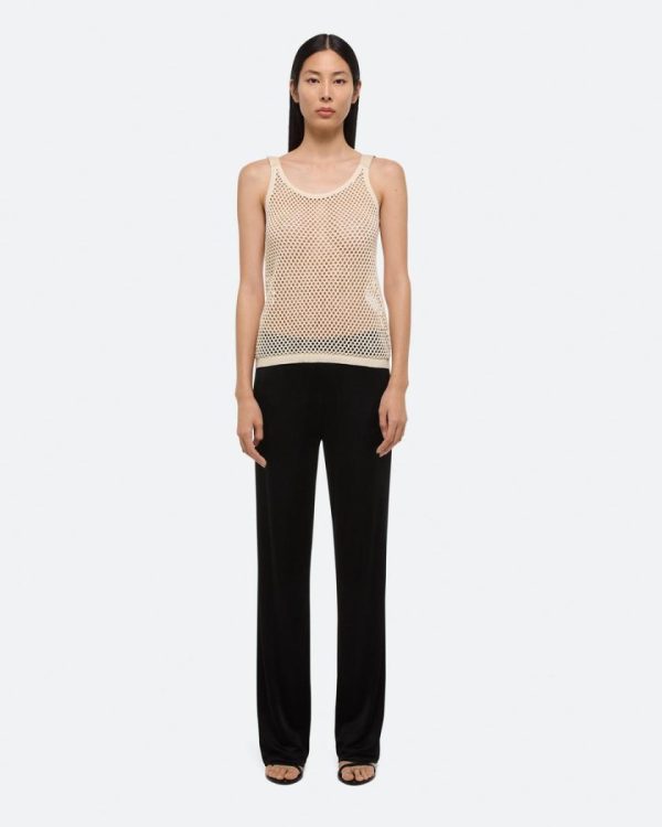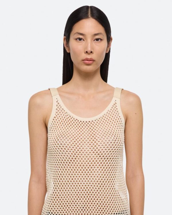 Cotton tank top in an open crocheted mesh. Finished with utility details and our signature seatbelt tape.Fits true to size. Model is 5’10” and wears size S.