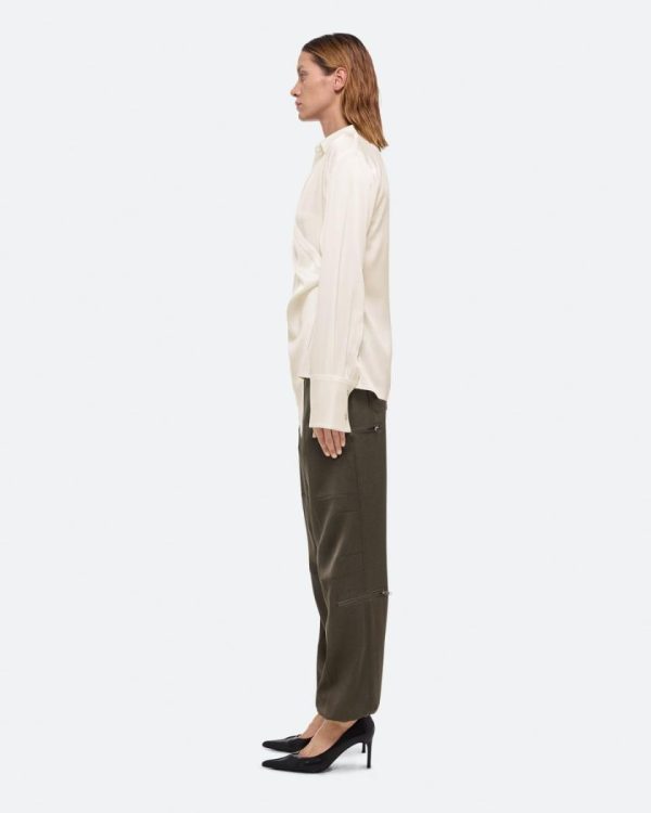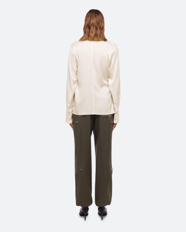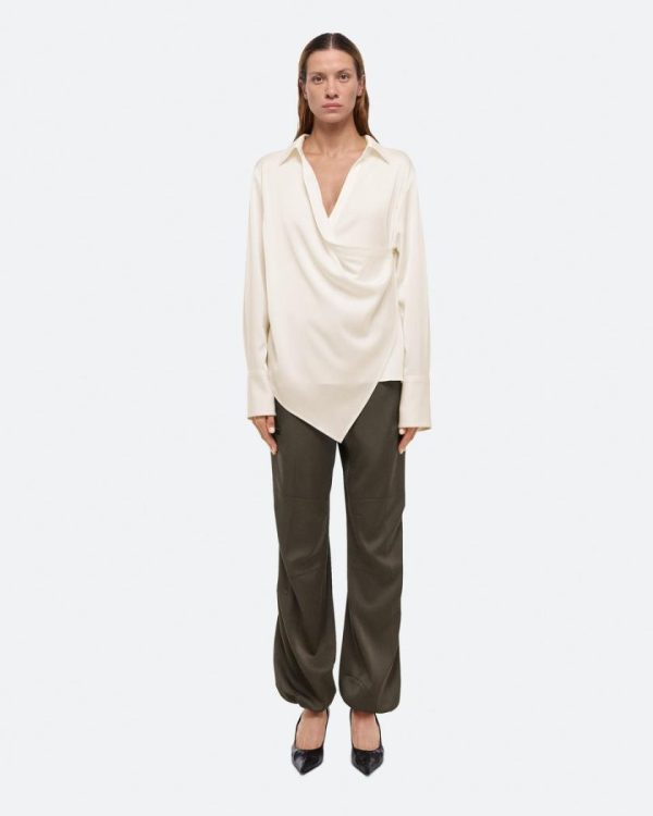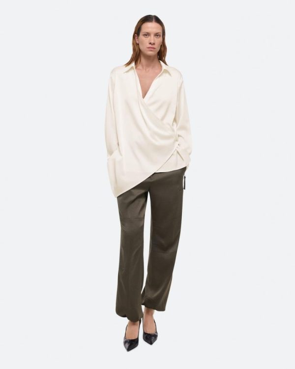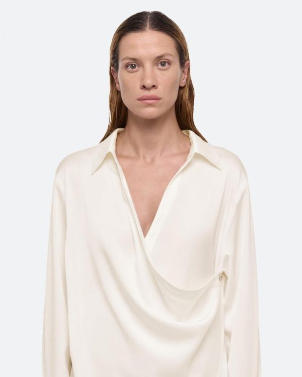 Wrap-front shirt in a fluid satin crepe. Adjust the depth of the wrap to control the amount of coverage, wear as a cowl neck, or leave open for a draped look.Fits true to size. Model is 6’1” and wears size S.