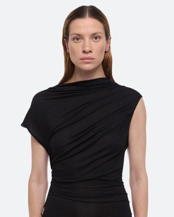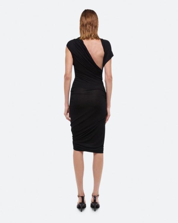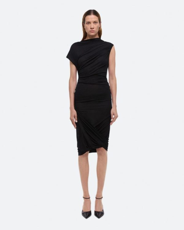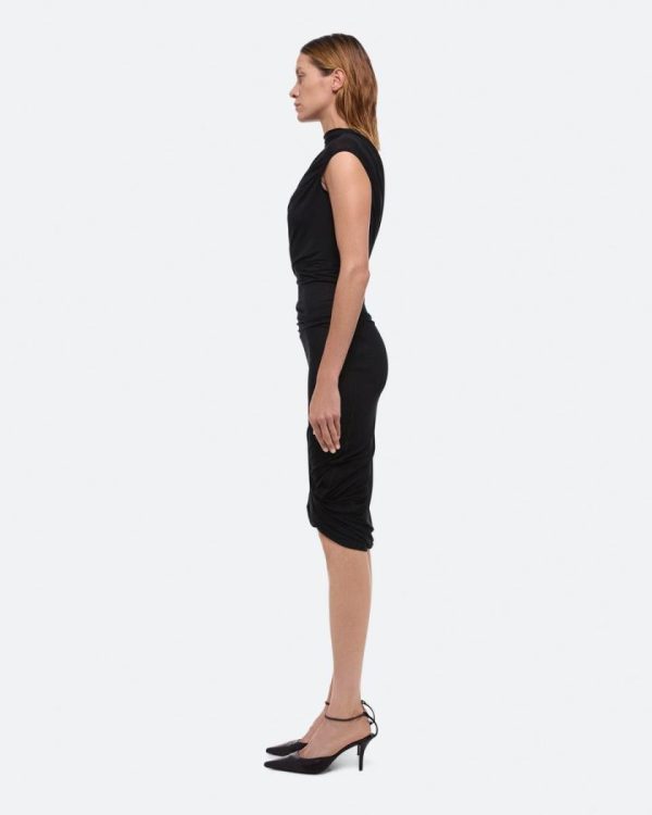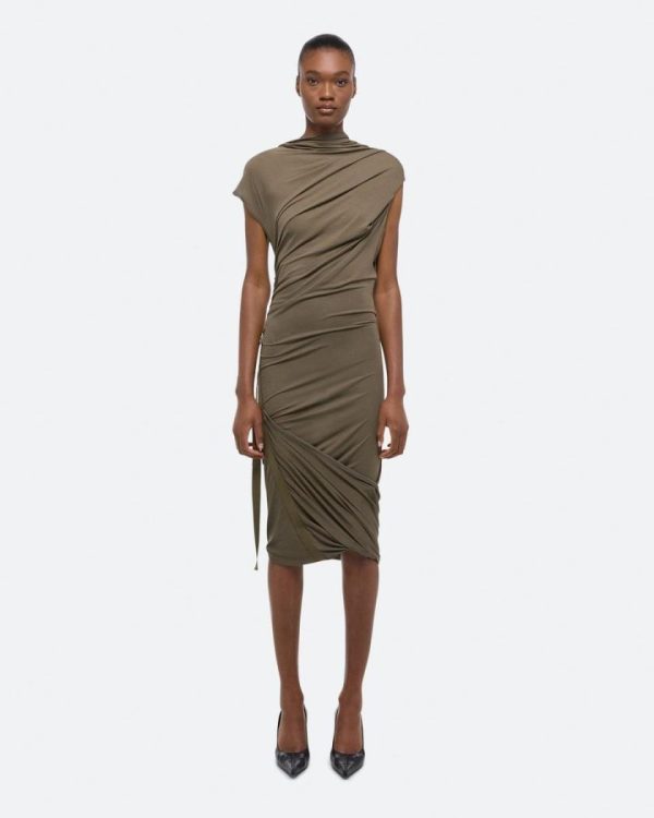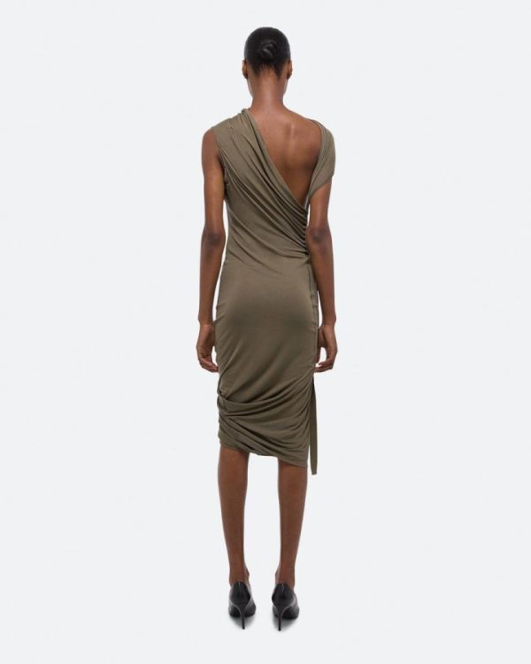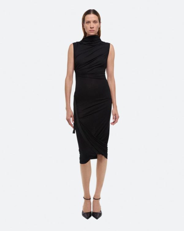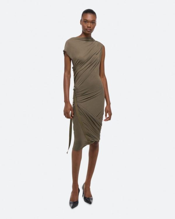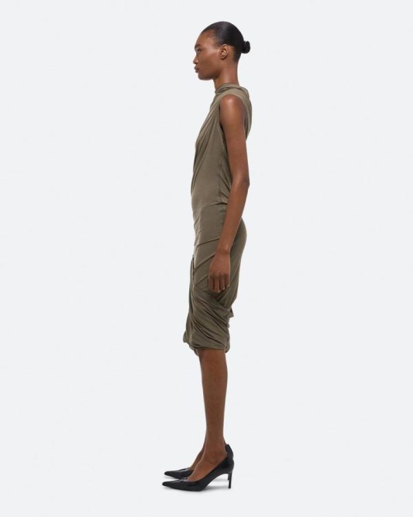 Sleeveless dress in soft lyocell jersey, draped to mimic the way fabric moves against the wind. Style the neckline as a bateau or a racerback. A tonal seatbelt strap allows the skirt to be worn as a mini or let down for more coverage.Fits true to size. Model is 6’1” and wears size S.