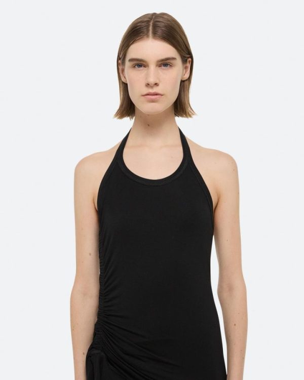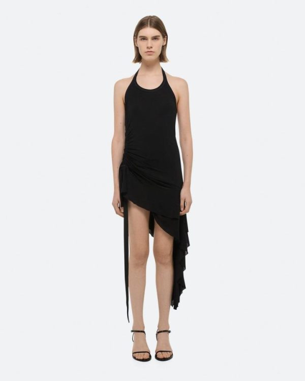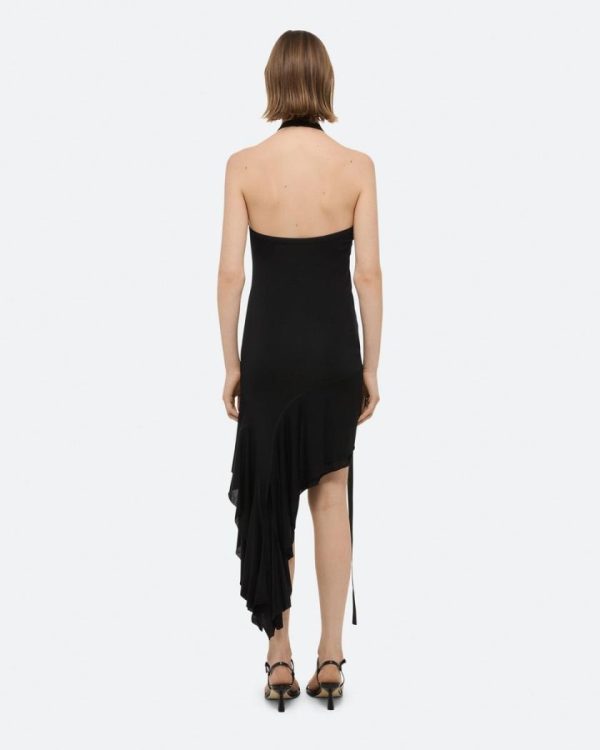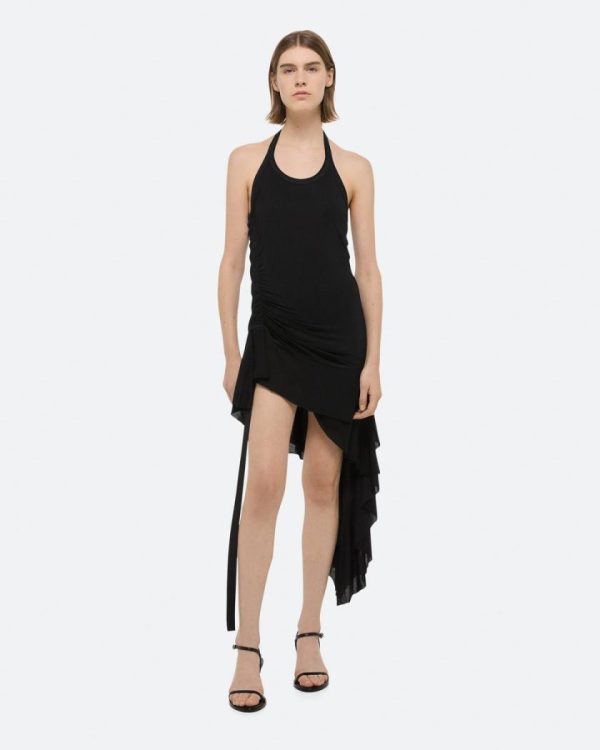 Halter-neck dress in soft lyocell jersey. Control the length using the signature seatbelt strap. Finished with an asymmetrical ruffled hem that adds movement to every step.Fits true to size. Model is 5’10” and wears size S.